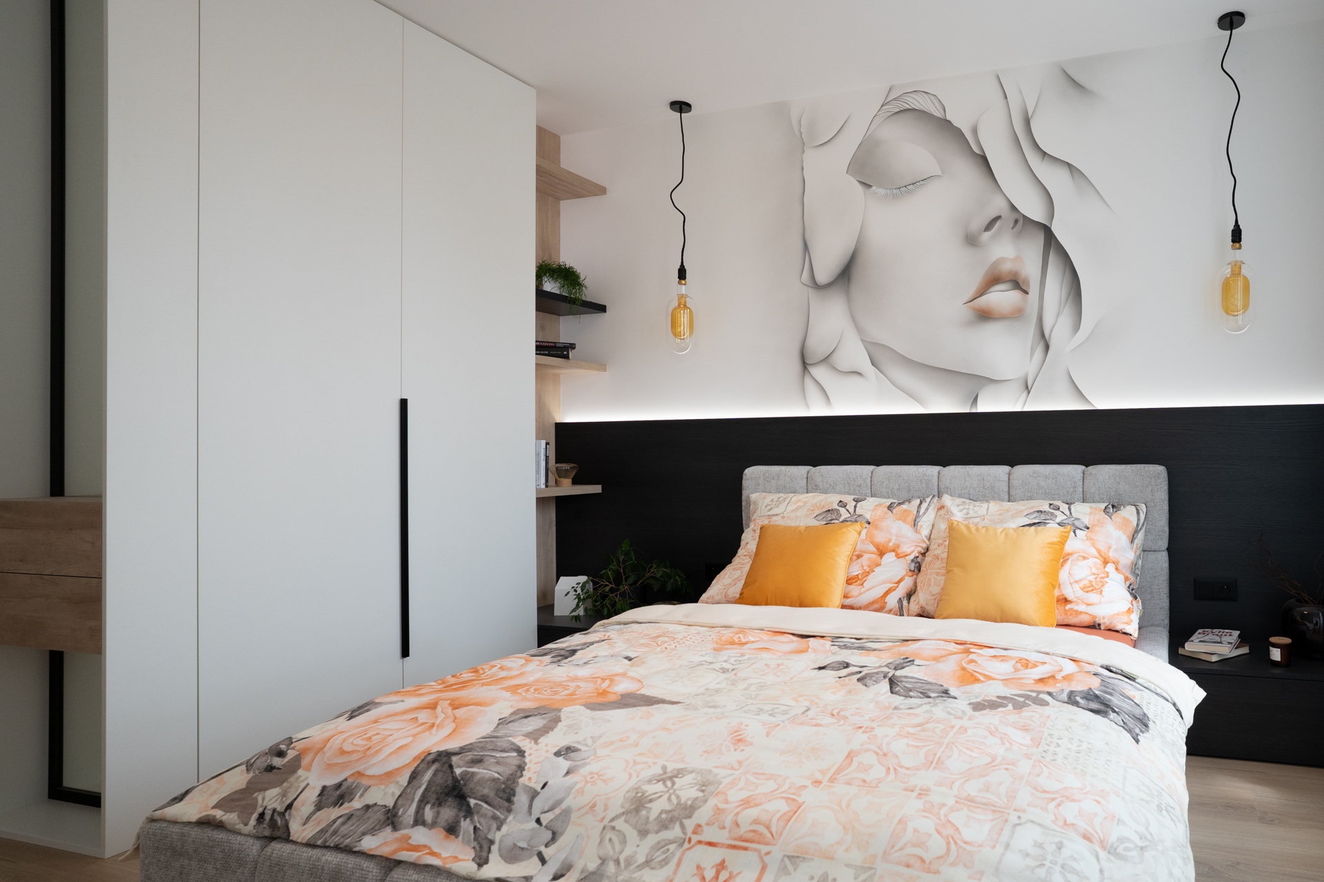 Vzorový byt o dispozici 2+kk na ploše 54 m² ukázal, že i novostavba v Praze může mít hlubokou osobitost. Designérka YIT Czechia Lenka Hlaváčková Schubertová ho oblékla do hřejivých hnědých tónů a doplnila o umělecké prvky, které návštěvníci obdivovali nejvíce. „Dominantou obývacího pokoje je výrazná umělecká malba květin, která prostoru dodává jemnost a charakter. Na ni v ložnici navazuje decentní motiv ženské tváře umístěný nad postelí, jež přináší nádech luxusu a originality,“ vysvětluje autorka návrhu s tím, že interiér do harmonického celku sjednocují přírodní tóny, bílo-šedá kuchyně a hnědá závěsná svítidla. Praktickým prvkem je pak bílá šatní skříň s integrovaným zrcadlem, která opticky zvětšuje prostor a zároveň nabízí dostatek úložného místa.