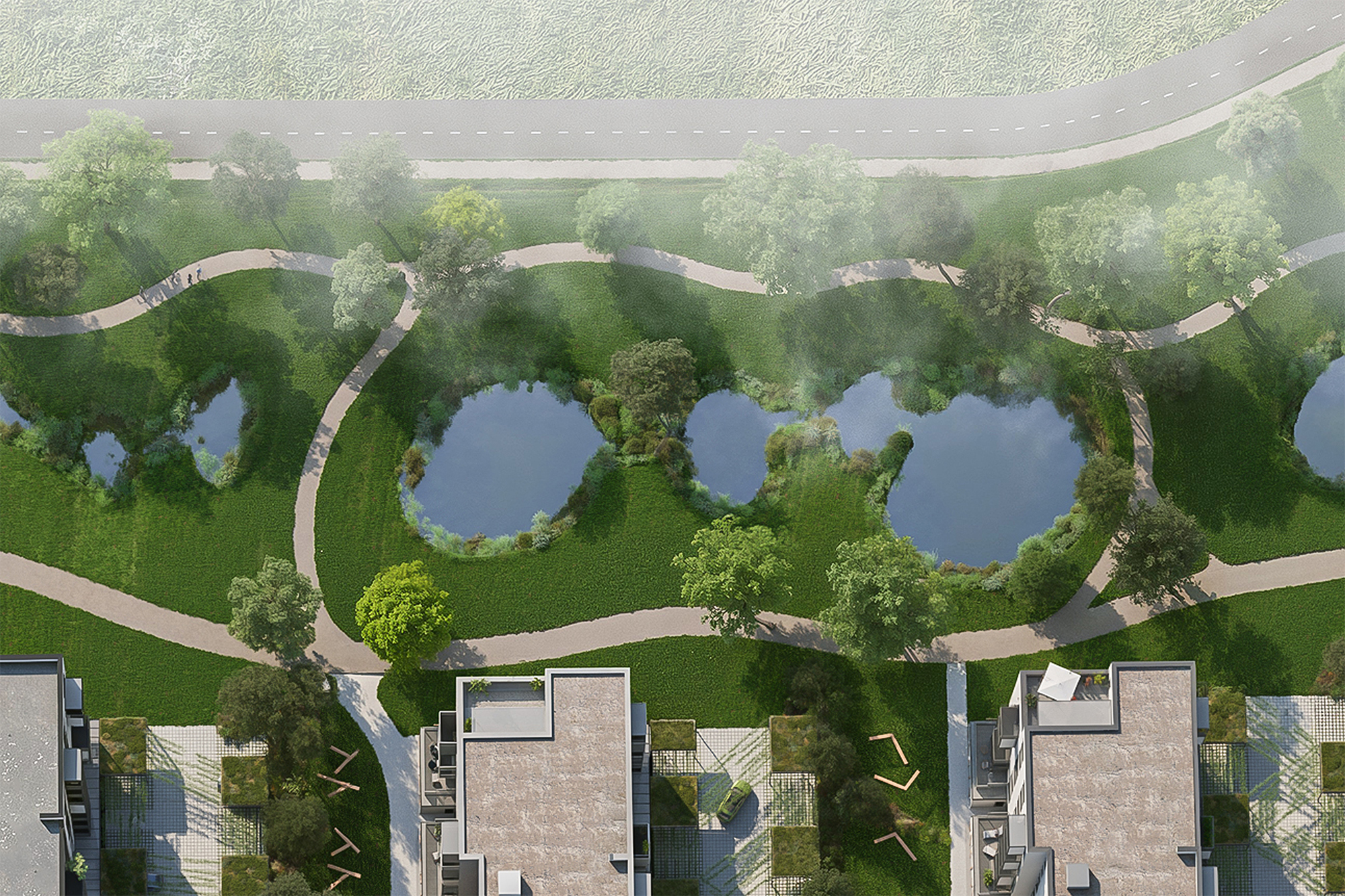 V rámci zelených ploch a parku zasadíme velké množství stromů a také růžových keřů v duchu tradice místa. Součástí parku budou i poldry pro přirozené zadržování dešťové vody v krajině.