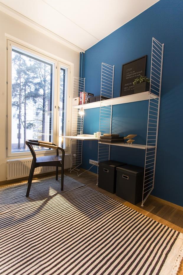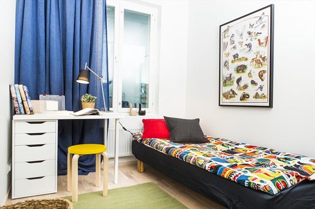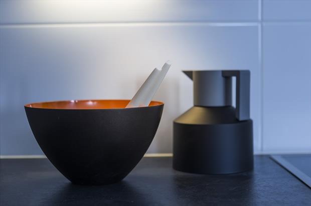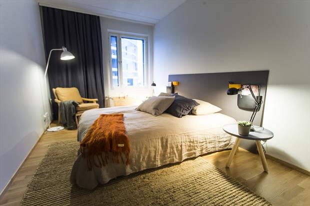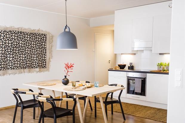 Prostorné bydlení, kde se mně osobně nejvíc líbí ložnice, kuchyň a bezvadný dětský pokoj. Ložnice díky lněnému povlečení a nočnímu stolku. V jednoduše zařízené kuchyni se pak krásně vyjímá stropní svítidlo Bell od Normann Copenhagen. Společnost YIT však pro své vzorové byty nepoužívá jen designové ikony, ale také originální skvosty z antiků a starožitností, což je případ koženého sofa v obývacím pokoji.