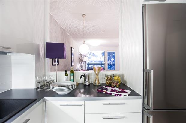 Díky akcentům růžové a fialové asi tušíte, komu má být určen tento byt. Líbí se mi ženské prvky použité nejen v ložnici a obývacím pokoji, ale také v kuchyni, protože i kuchyň může být elegantní. Barvy i doplňky propojují všechny pokoje v jeden uhlazený celek.